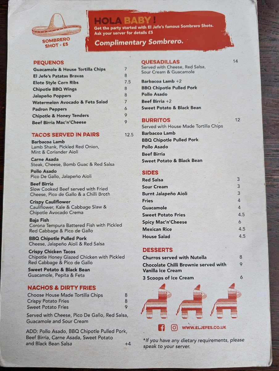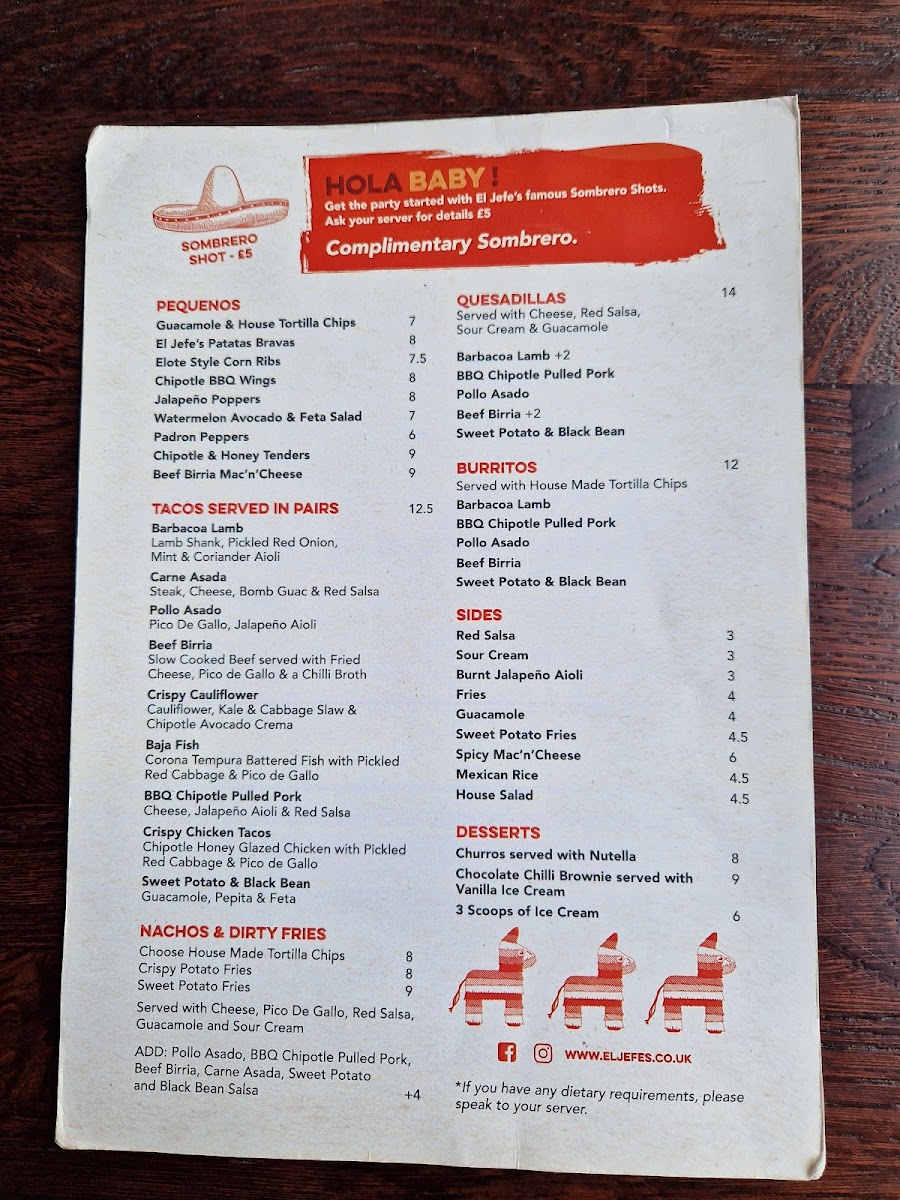 El Jefes in Giffnock, Glasgow, located at 219 Fenwick Rd, Giffnock, G46 6JD, offers a delightful dining experience for anyone craving authentic and vibrant Mexican cuisine. The menu at El Jefes Giffnock stands out for its wide variety of flavors, blending traditional Mexican recipes with fresh, local ingredients.